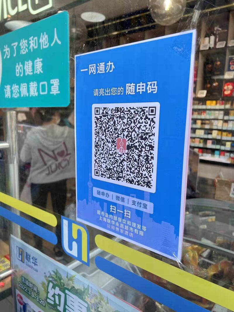 联华超市曹家渡店不仅要出示健康码,还要求扫“场地码”,以确保顾客的轨迹追踪。
