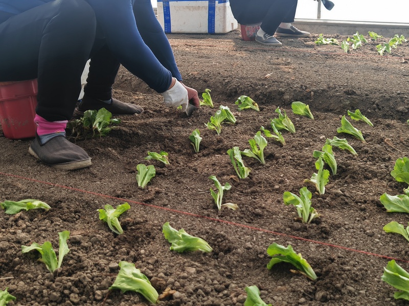 上海春昌蔬果专业合作社社员正在移栽生菜苗。