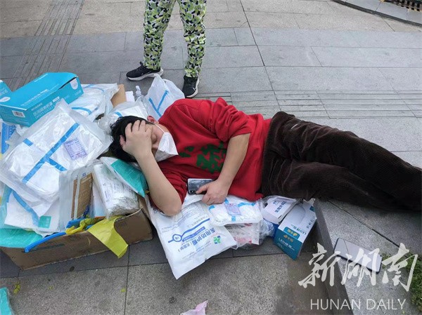 (图为社区工作人员连续工作20多小时后趴地休息)