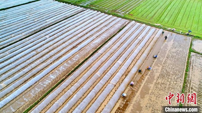 3月22日,江西省赣州市南康区镜坝镇早稻集中育秧基地,村民冒着细雨在翻耕好的农田摆秧盘、平厢面、撒种覆膜。春分时节,老区赣南各县、市(区)采取“行政村+种粮大户+专业合作社”的集中育秧模式,进一步整合农田、技术、劳动力等生产要素,大面积推广早稻集中育秧、联合育秧,提高早稻生产集约化、专业化水平,为早稻插秧做足准备,助力全年粮食生产稳产增收。