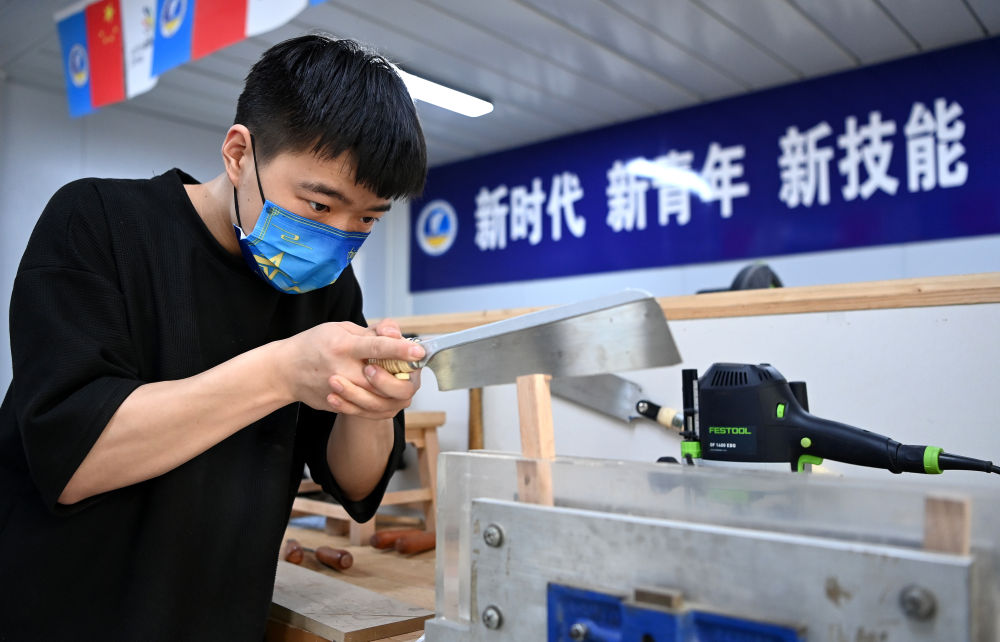 西安建筑工程技师学院学生余家豪在进行精细木工项目训练(4月27日摄)。新华社记者刘潇摄