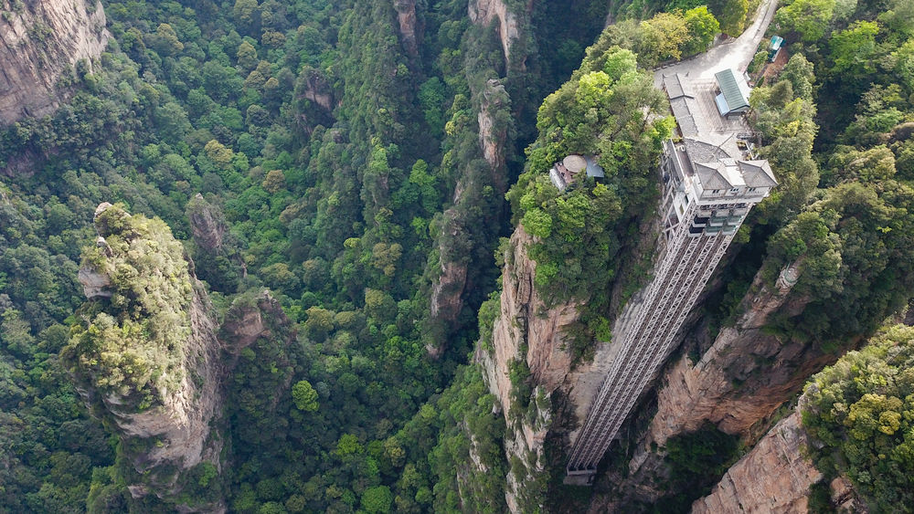这是4月19日拍摄的武陵源风景名胜区袁家界百龙天梯景点(无人机照片)。新华社记者 陈泽国 摄