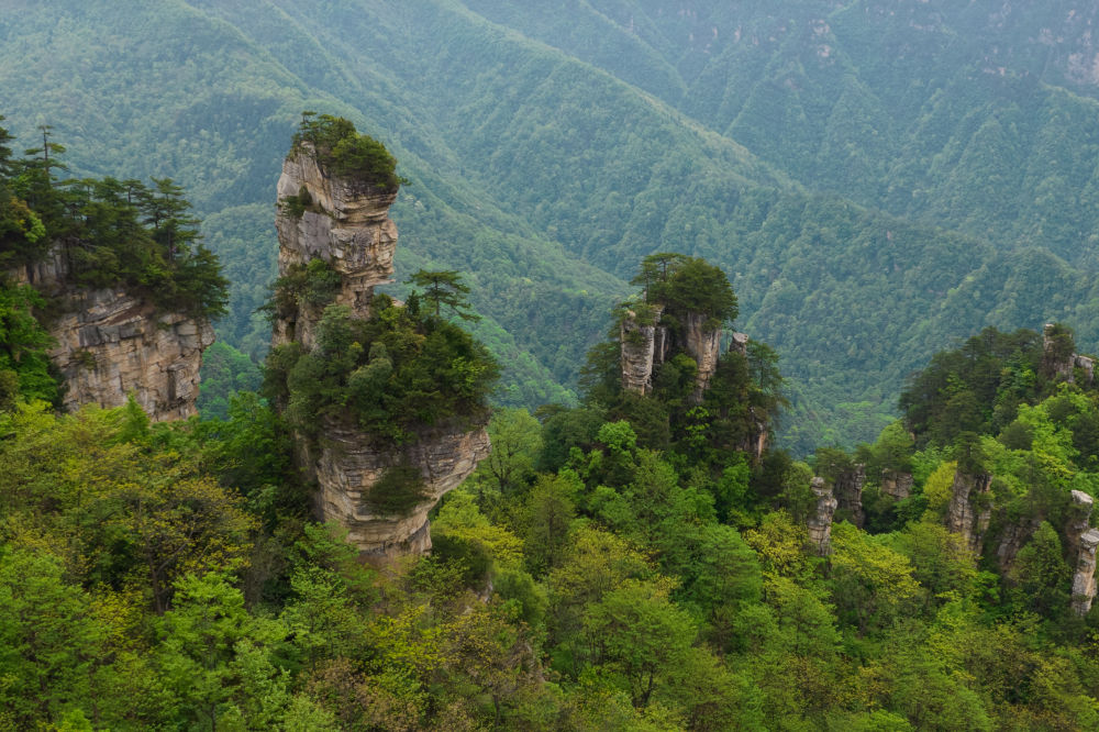 这是4月19日拍摄的武陵源风景名胜区袁家界神兵聚会景点(无人机照片)。新华社记者 陈思汗 摄