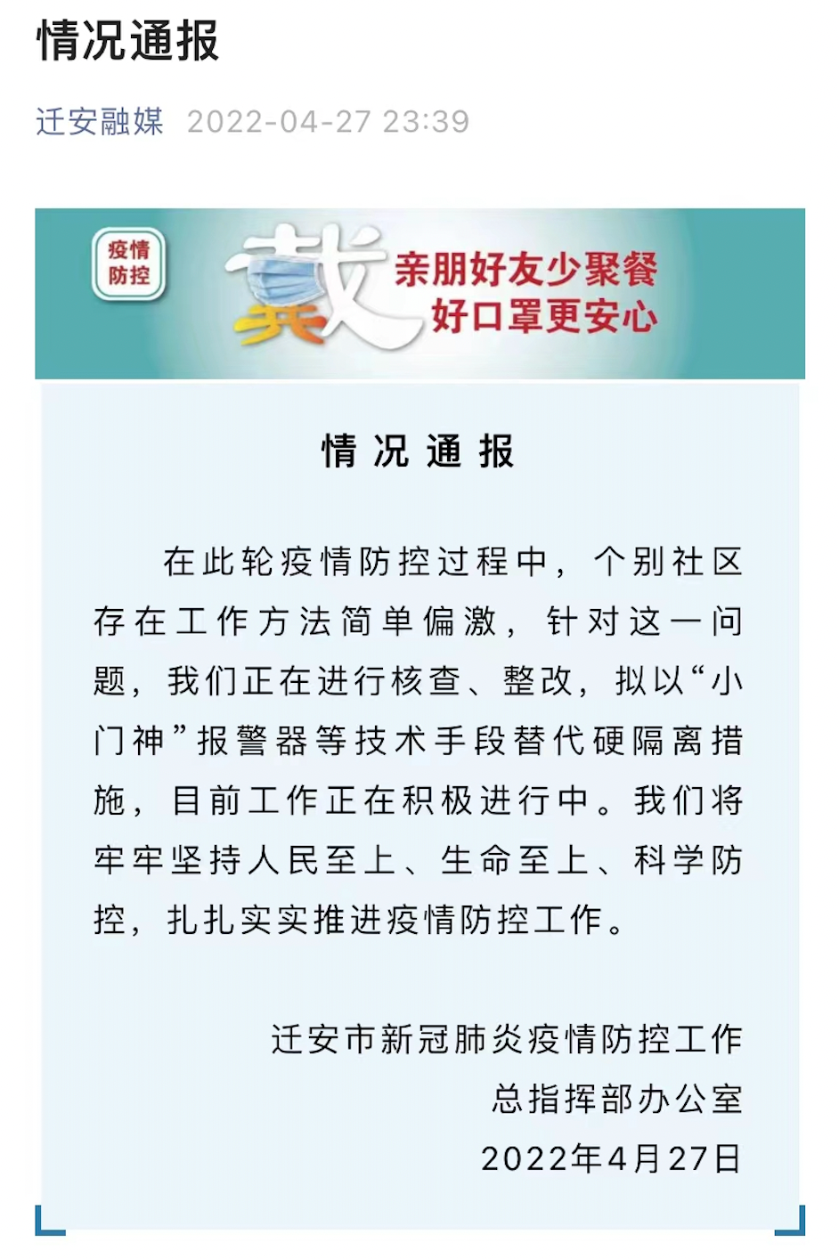 4月27日深夜,河北迁安疫情防控总指挥部发布通报,称当地个别社区“工作方法简单偏激”,正在核查、整改,准备用“小门神”报警器等技术手段“替代硬隔离措施”。及时纠错是对的,但不能总是等到舆情发酵后才“迫于压力”反思或被动纠错。需要群众配合的事情,得下绣花功夫,而不是图省事蛮干。