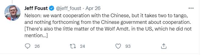 美国航天新闻网资深撰稿人福斯特在推特上转引了尼尔森的话,并指出尼尔森没有提“沃尔夫条款”。
