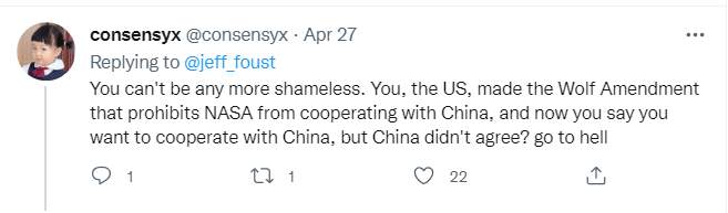 真是再无耻不过了。美国颁布了沃尔夫条款,禁止美国宇航局与中国合作,现在又来说要与中国合作,是中国不同意?见鬼了……