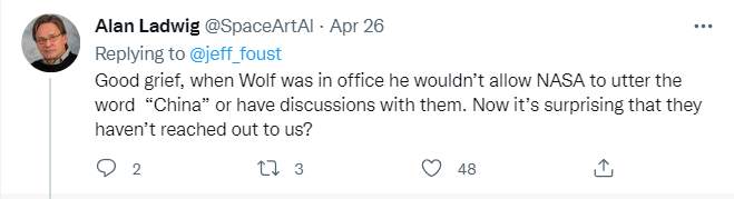 呵呵,沃尔夫在任时,不允许美国宇航局说“中国”这个词或与他们进行交流。现在却来怪中国没有联系我们?