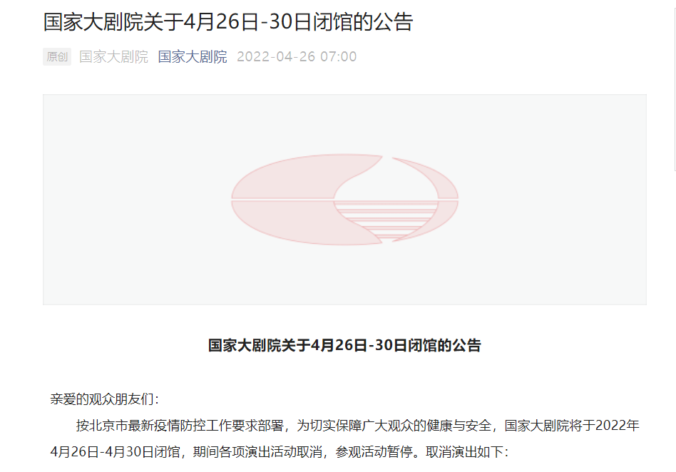 按北京市最新疫情防控工作要求部署,为切实保障广大观众的健康与安全,国家大剧院将于2022年4月26日-4月30日闭馆,期间各项演出活动取消,参观活动暂停。取消演出如下: