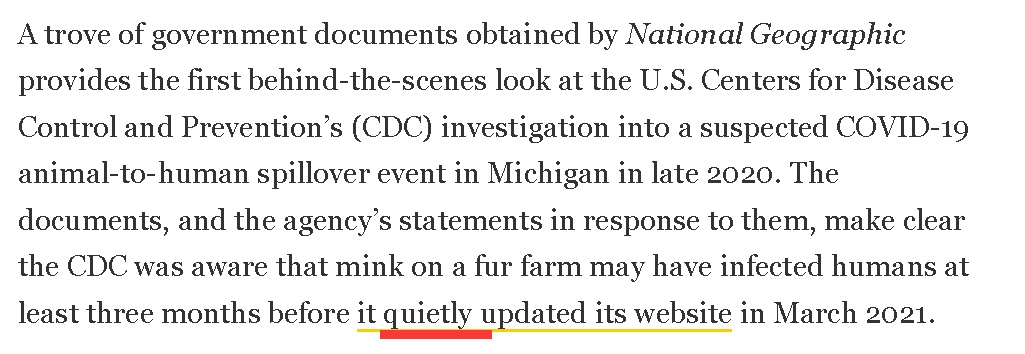 美国疾控中心后来声称,他们之所以没有立刻报告当时在水貂农场发现的情况,是因为欧洲之前已经出现了这种可以通过水貂传染给人类的新冠病毒毒株,所以他们觉得在美国发现这一情况“并不令人意外”,该病毒的毒株信息也被欧洲披露过,且自疫情出现以来,也没有证据显示水貂在疫情中扮演过什么重要角色,所以美国疾控中心觉得他们的做法没什么问题。而且美国疾控中心还称,这些信息最终在2021年3月也被他们自己披露出来了。