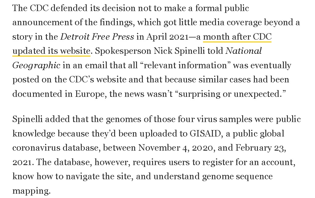 然而,美国疾控中心并没有及时披露这一发现,而是直到2021年3月才将这些情况发布在其官网上。“国家地理”网站在形容美国疾控中心这一行为时,还特地使用了“悄悄”一词。