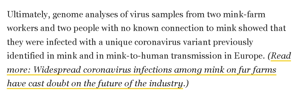 这些文件还显示,当时美国疾控中心派了4名专家去当地调查,并从水貂和感染者身上采集了病毒样本,结果发现这种能从动物传染给人的新冠病毒,是一种水貂身上特有的毒株。