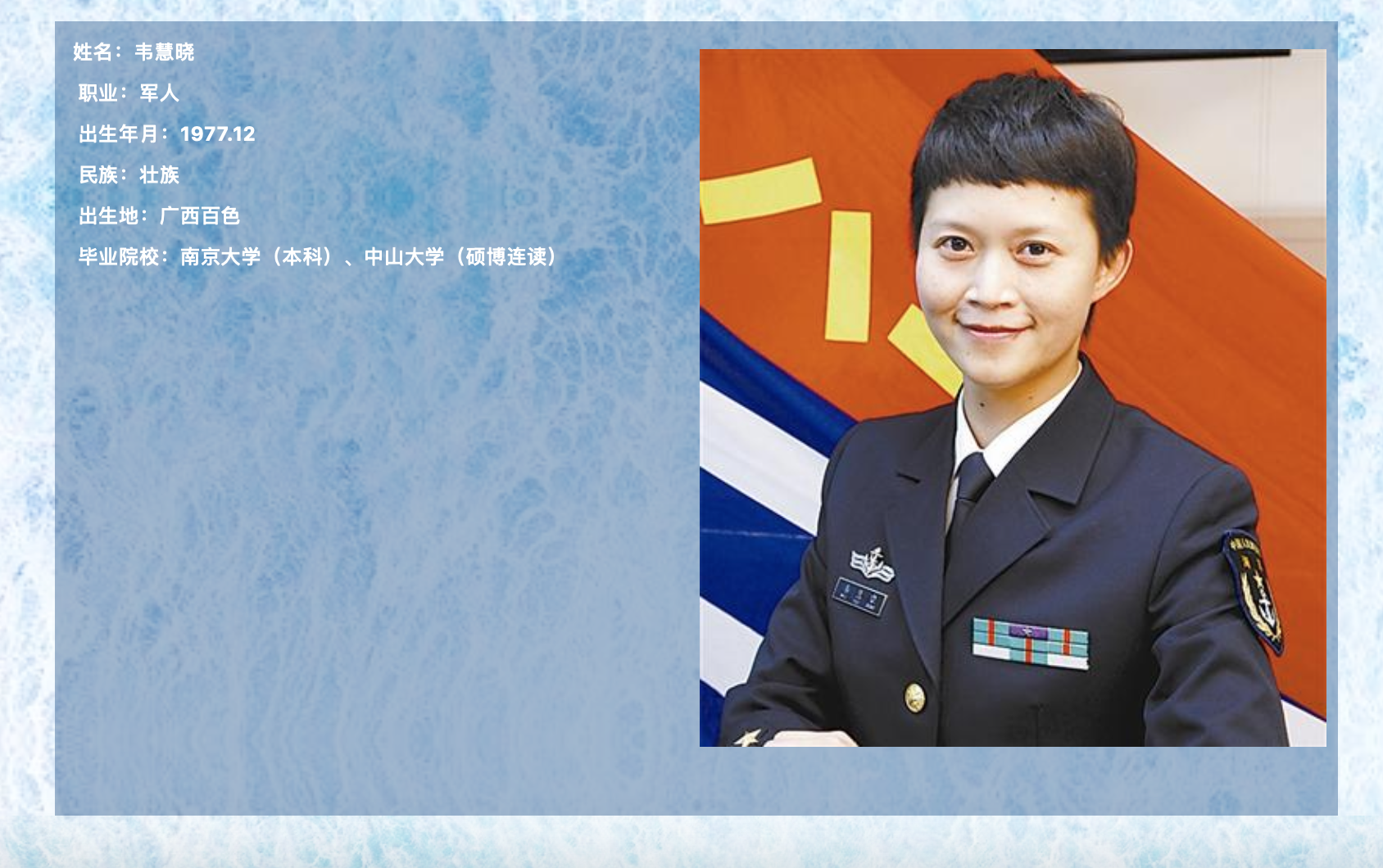 2012年2月,35岁的韦慧晓从中山大学地球科学系博士毕业,成为我国首艘航母辽宁舰的一员。她随后在当年10月获任航海部副航海长,成为航母上第一位女副部门长。