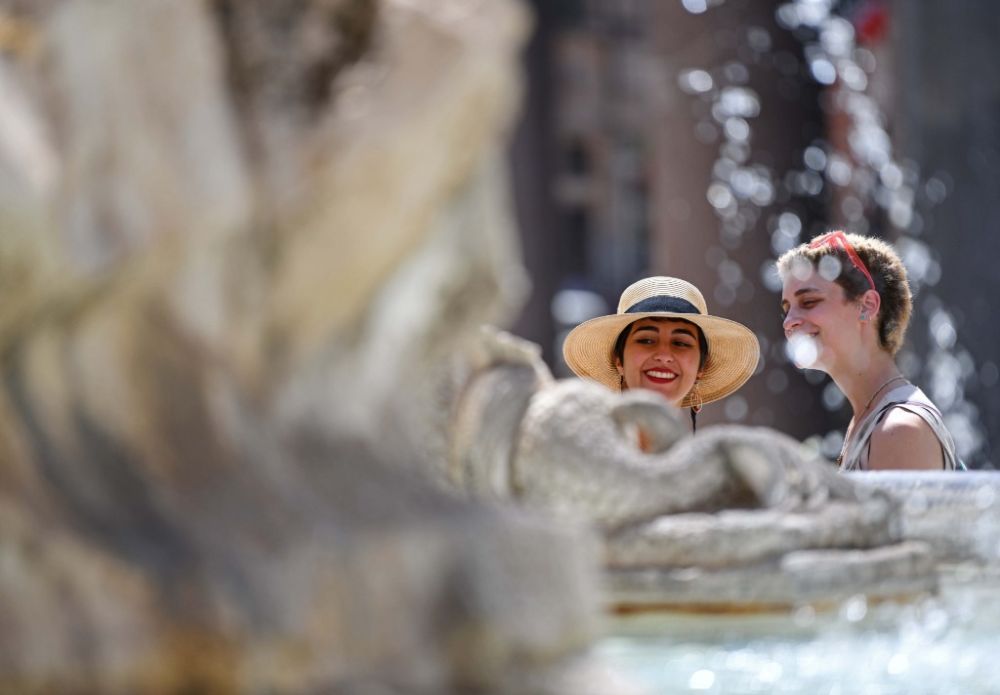 2021年8月12日,两名游客在意大利罗马的一处喷泉旁纳凉。新华社记者金马梦妮摄