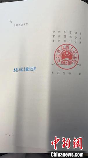 福建省高级人民法院于2022年3月21日下发的刑事裁定书。 受访者供图
