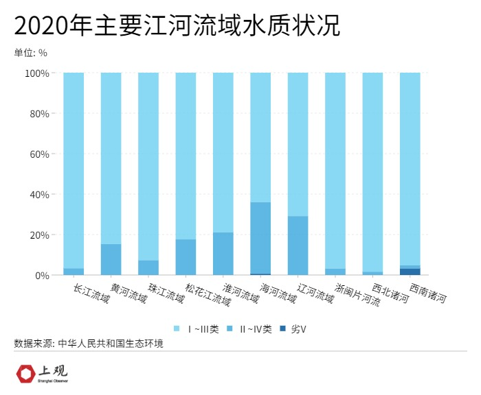从全国主要江河流域来看,长江流域、珠江流域、浙闽片河流、西北诸河和西南诸河水质为优,Ⅰ~Ⅲ类水质断面超过90%;黄河流域、松花江流域和淮河流域水质良好;辽河流域和海河流域为轻度污染。
