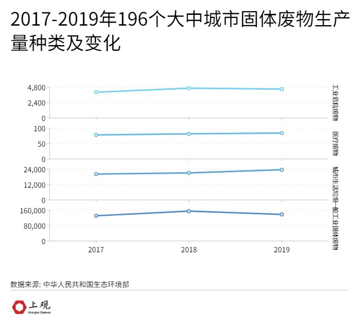2020年,全国共有196个大、中城市向社会发布了2019年固体废物污染环境防治信息,数据显示,一般工业固体废物产生量最多,高达13.8亿吨,其次是城市生活垃圾,2356.2万吨,紧随其后的是工业危险废物4498.9万吨,医疗废物84.3万吨。
