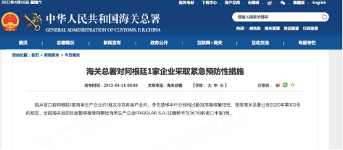4月16日,进口自阿根廷1家肉类生产企业的1批次冷冻肉类产品内、外包装样本中分别检出新冠病毒核酸阳性,全国海关自即日起暂停接受阿根廷肉类生产企业FRIGOLAR S.A.(注册编号为3676)的进口申报1周。