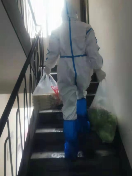 蔡晟轩负责的是一栋7层高的楼梯房,有30多户住户,他需要独自一人完成近60人的物资配送和垃圾回收,兼顾楼道巡逻、信息统计、垃圾清运、日常消杀等工作。为了把堆积得像小山一样的物资及时送到居民手中,蔡晟轩每天全副武装,一趟一趟地小跑着配送。同时,他还需要注意错开物资配送和垃圾清运的时间。