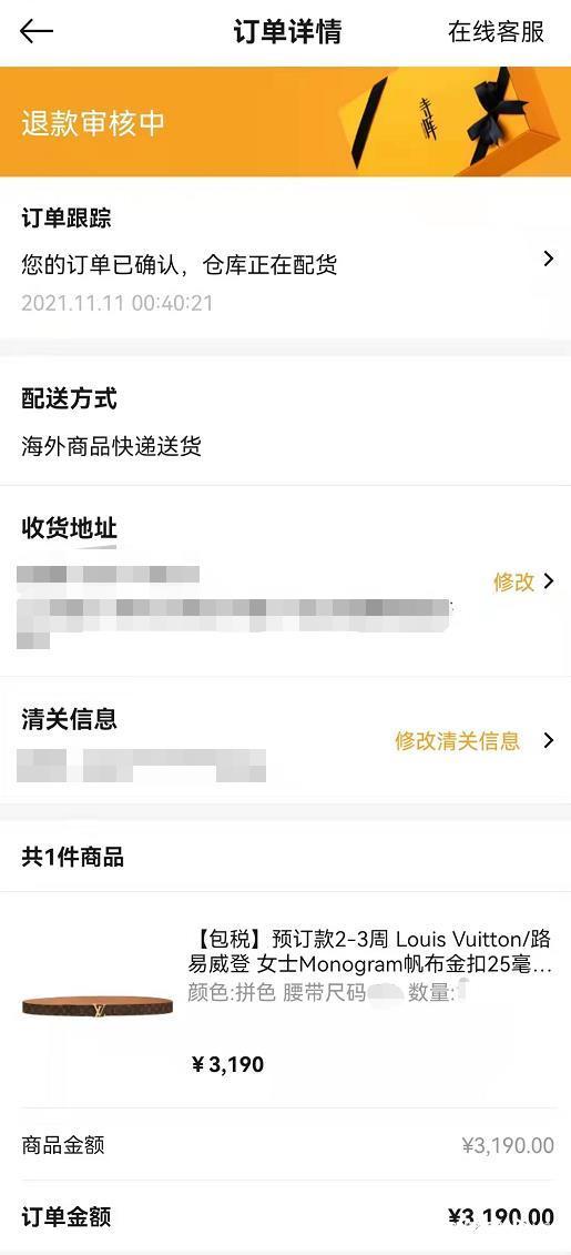 “去年双十一就买的东西,到现在也没发货,申请退款也不处理,感觉被骗了。”近日,记者接到消费者张琳(化名)投诉,称其在去年双十一期间在寺库平台购买一条价值3190元的LV腰带,等待三个多月也没有发货,要求退款也迟迟未到账,在网上一搜发现类似遭遇的还有不少,希望记者帮关注。