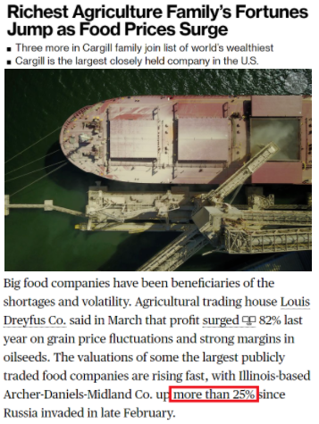 而在多国民众为粮价上涨忧心忡忡的时候,美国的粮食巨头们却在这场危机中财富暴增。