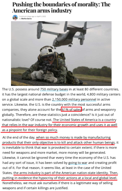 欧洲“现代外交”网站:美国军工企业靠生产和售卖杀人武器大赚其财,不难想象,许多战争在一定程度上是被它们挑起的。军火工业已经成为美国国家身份的一部分,美国行为的虚伪性正在全球层面暴露出来。