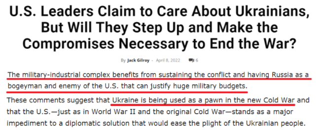 美国《隐蔽行动》杂志的评论文章更是一语中的:美国只是把乌克兰当成“新冷战”中的一枚棋子。通过加紧对乌进行军事援助加剧俄乌冲突,美国军工复合体就会从持续的战火中受益。
