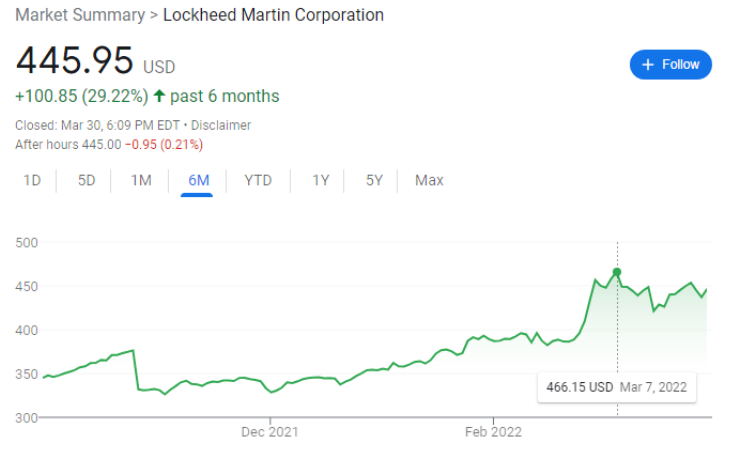 过去六个月,美国五大军火商中的“老大”洛克希德·马丁公司股价暴涨近30%。