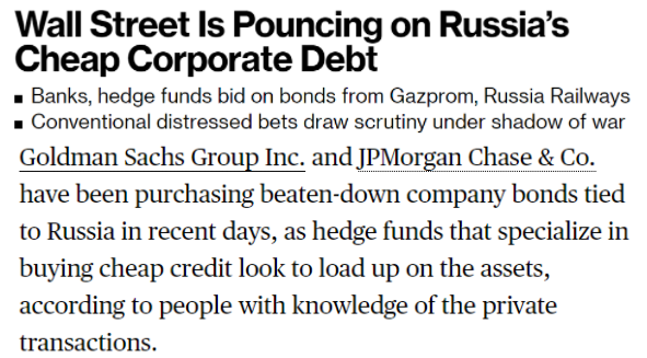 彭博社:高盛和摩根大通近期一直在购买与俄罗斯有关的公司债券,寻找有利可图的套利机会;专门紧盯廉价信贷的对冲基金也希望趁机增持这些价格暴跌的俄罗斯资产。
