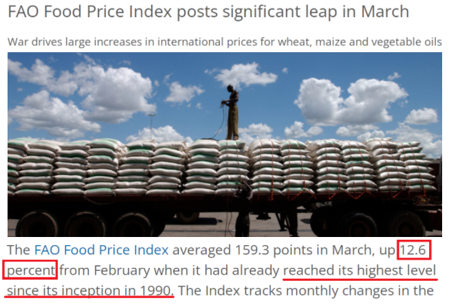 联合国粮农组织日前发布的报告显示,该组织3月全球食品价格指数较2月上涨12.6%,创下该指数自1990年创立以来的最高纪录。