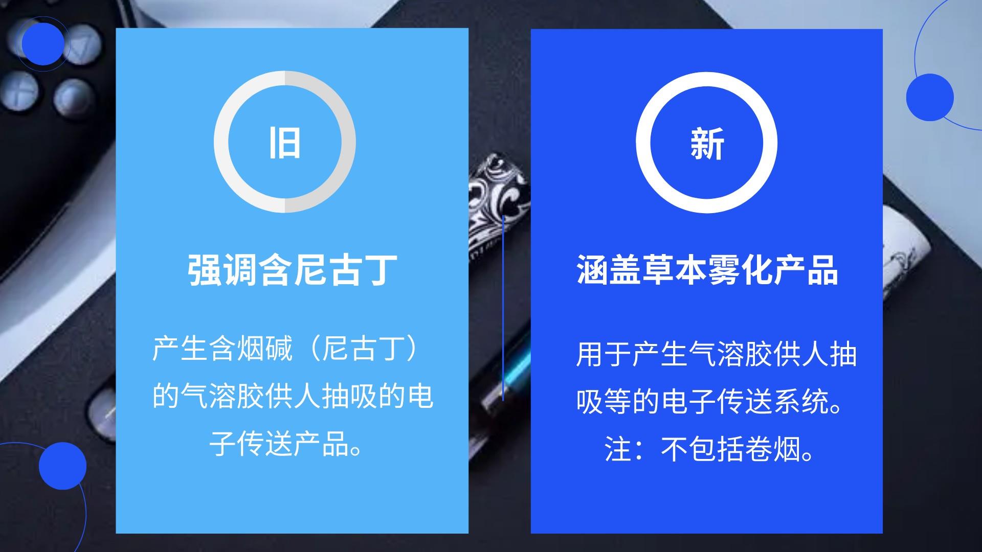 电子烟国标中对电子烟的定义进行了更新,按照新的标准,受到国家监管的产品种类将增加。包括此前通过从非烟草本植物中提取成分,雾化后抽吸,以此和电子烟“切割”的草本雾化类产品也将被纳入国标的监管。