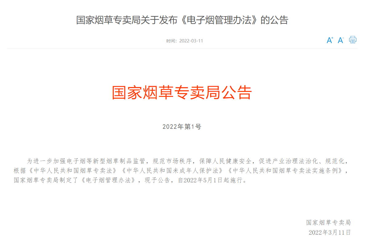 作为电子烟新国标的配套措施,国家烟草专卖局在今年3月11日公布了《电子烟管理办法》,将于5月1日起正式实施。