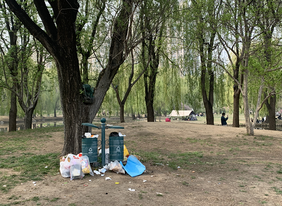星河湾生态公园位于朝阳大悦城附近,由于位置便利,园内有花有水,成为附近居民露营的首选地。周末的下午,从大门处的草地开始,各类帐篷就星罗棋布,湖边、樱花树下都是扎营打卡的游人,堪称“一位难求”。然而,偌大的公园里却没有卫生间,想方便的市民只能走出公园,到门外的一家酒店如厕。不仅如此,园区道路上随处可见被扔的口罩、餐巾纸和塑料袋。记者走了一圈下来,仅在湖边看到5个塞得满满的垃圾桶,溢出的垃圾袋遍布垃圾桶四周,十分影响美观。除了湖边,园内再也难寻分类垃圾桶的踪影。由于处理不及时,还有的白色垃圾被吹到草丛中,清理更加困难。