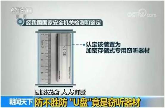 该设备被送回国内后,国家安全机关进行了检测和鉴定,认定该装置为加密存储式专用窃听器材,外观伪装为普通U盘,内置两个微型麦克风,由内设的3.7V锂电池供电,用隐藏式微型按钮实现工作状态控制,具有数字加密录音功能。