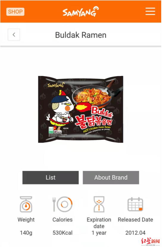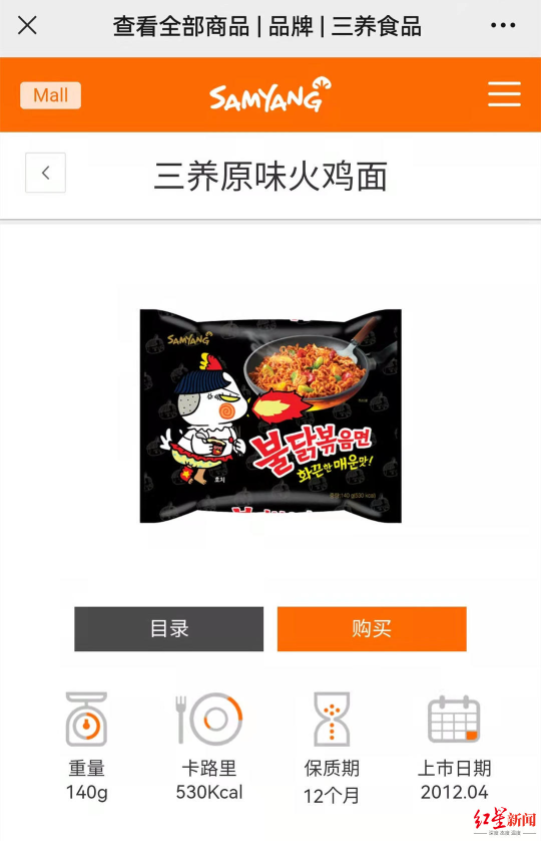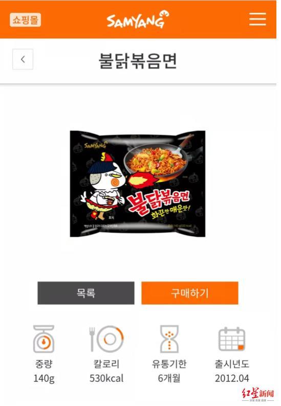 该网友爆料的为三养(SAMYANG)火鸡面,据了解,这是一款在中国颇受欢迎的韩国方便面。据三养食品电商平台显示,其中销量最好的招牌超辣鸡肉味火鸡面5连包销量超2万包,评价超6万条。自进入中国市场以来,该品牌的火鸡面就成为了一款“网红”食品,在年轻人当中拥有颇高人气。