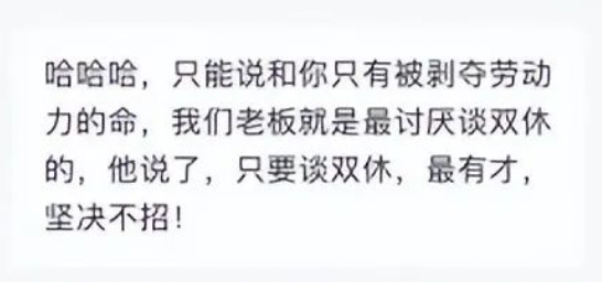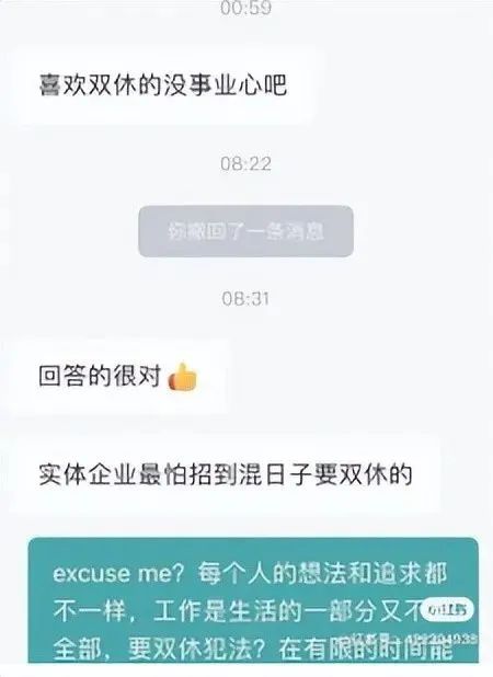 在聊天过程中,该HR还表示,老板说过最讨厌谈双休的,只要谈双休,再有才也坚决不招,最怕混日子要双休的。招聘者随之回复称是其老板的格局问题。