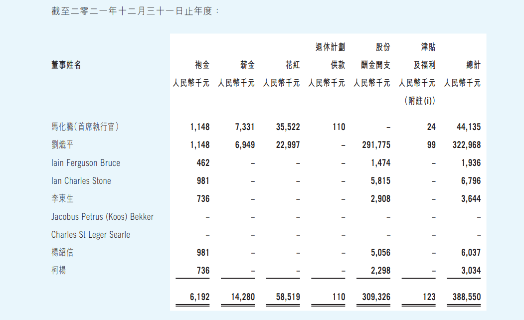 2020年,刘炽平年度薪酬为4.277亿元,其中股权薪酬为3.863亿元,奖金为3360万元,其股权薪酬在2021年明显降低。