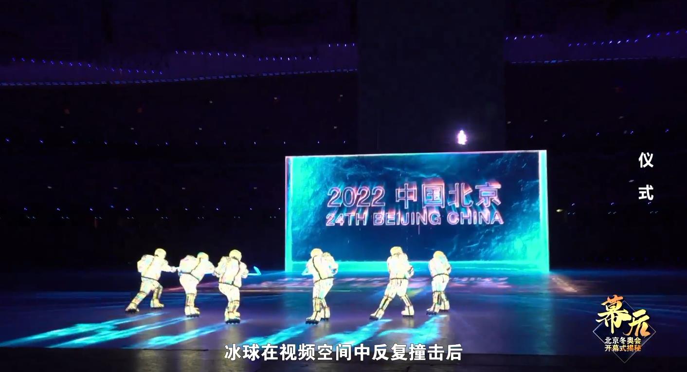 雕刻时光的呈现最终确定为用激光勾勒运动线条。同时6位未来冰球队的运动员上场与影像冰球击打互动,冰球在视频空间中反复撞击后,冰立方渐渐碎裂,破冰呈现五环。