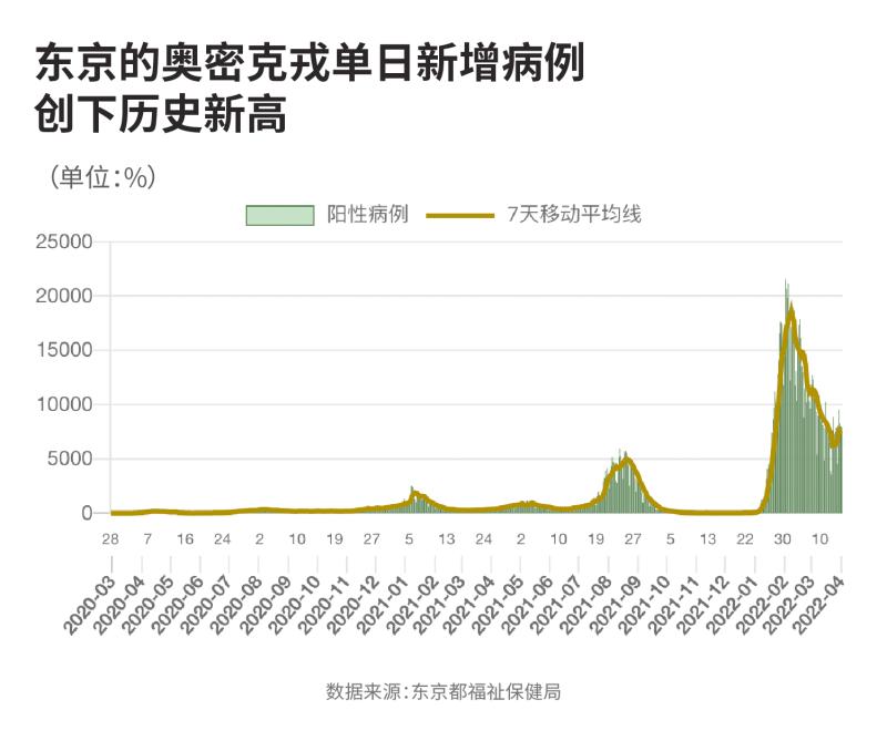 日本于11月30日发现首例奥密克戎病例,新增病例数从1月开始直线上升。东京的确诊病例数在今年2月初达到峰值,达21,576例,占到全国的四分之一,病例数在全日本最高。在之后的两个月里,单日新增病例数在波动中呈现出缓慢下降的趋势。截至4月1日,东京的单日新增确诊病例仍有7千多例。