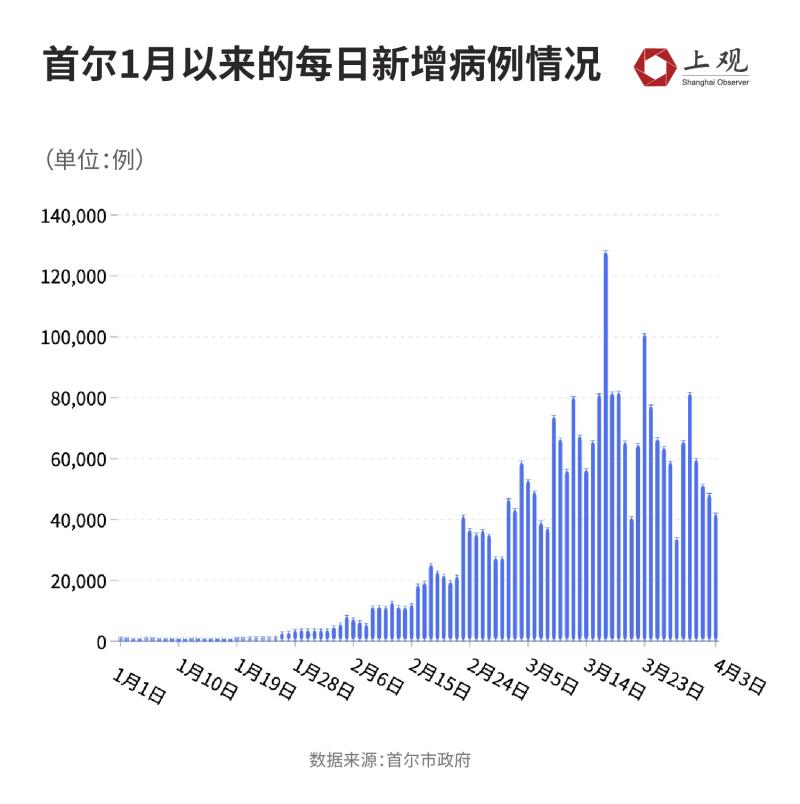 首尔疫情从1月底开始迅速发展,单日新增病例数从近千例不断翻倍,最高峰出现在3月18日,达到近13万例,占全国病例数的三分之一,创下新冠疫情流行以来的历史最高纪录。之后新增病例数开始缓慢下降,但每日仍有数万例。