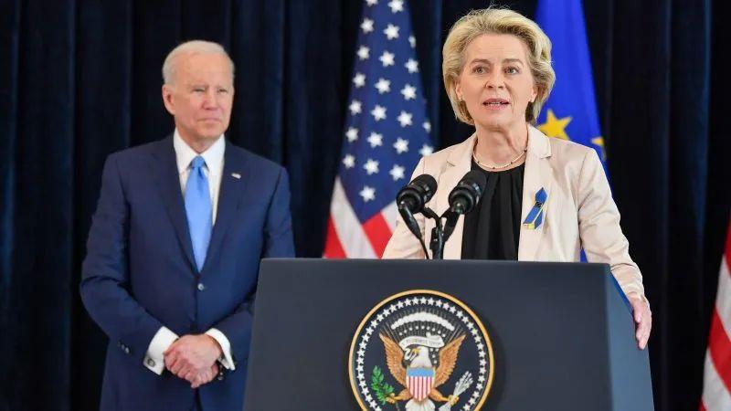 ▲25日,冯德莱恩与拜登在布鲁塞尔举行的联合新闻发布会上发表讲话
