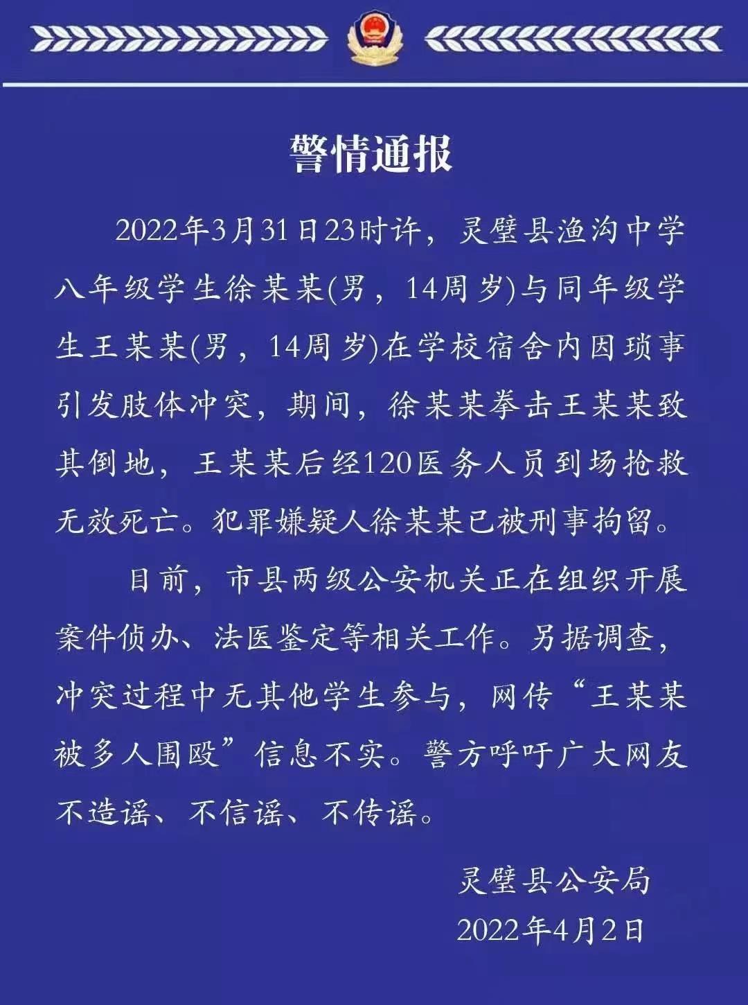 安徽省灵璧县公安局今天(4月2日)发布通报称:2022年3月31日23时许,灵璧县渔沟中学八年级学生徐某某(男,14周岁)与同年级学生王某某(男,14周岁)在学校宿舍内因琐事引发肢体冲突,其间,徐某某拳击王某某致其倒地,王某某后经120医务人员到场抢救无效死亡。犯罪嫌疑人徐某某已被刑事拘留。