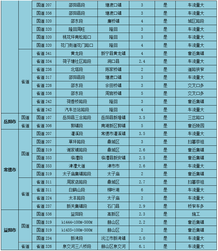 具体为:许广高速与长张高速合流点简家坳枢纽,益阳绕城高速与长张高速合流点苏家坝枢纽,24-26km、40km、48-49km的东往西爬坡路段,长张高速33km宁乡服务区进出口处,长张高速63km益阳服务区进出口处。