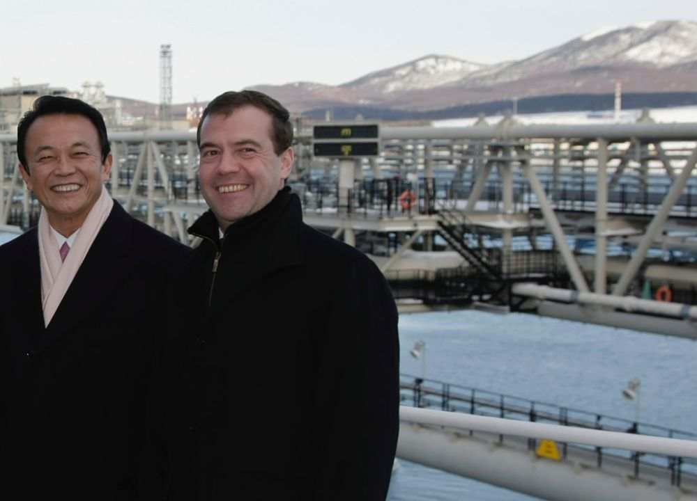 2009年2月18日,在俄罗斯远东城市南萨哈林斯克,时任俄罗斯总统梅德韦杰夫(右)与时任日本首相麻生太郎参观双方在当地合作建造的“萨哈林2号”项目框架下的液化天然气工厂的投产仪式。新华社发