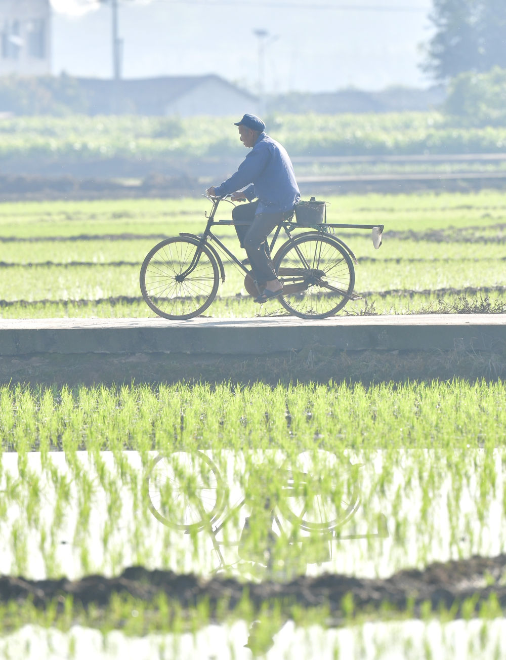 4月4日,在广西南宁市宾阳县古辣镇梨园村,村民在田间骑行,准备劳作。