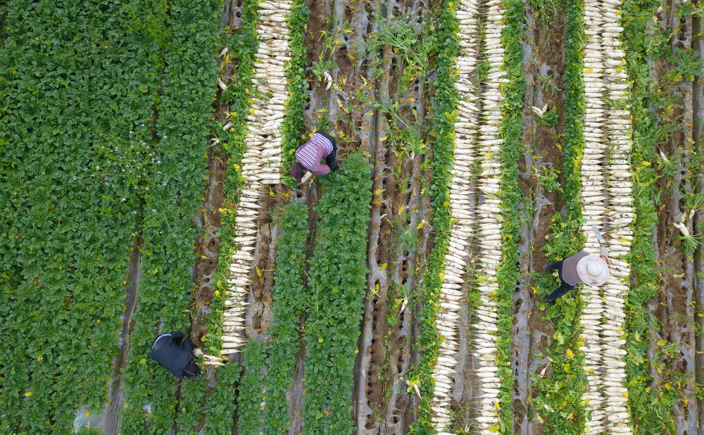 4月3日,在四川省南充市嘉陵区河西镇“好土优土”有机农场钻石岛基地,村民们忙着抢收萝卜(无人机照片)。