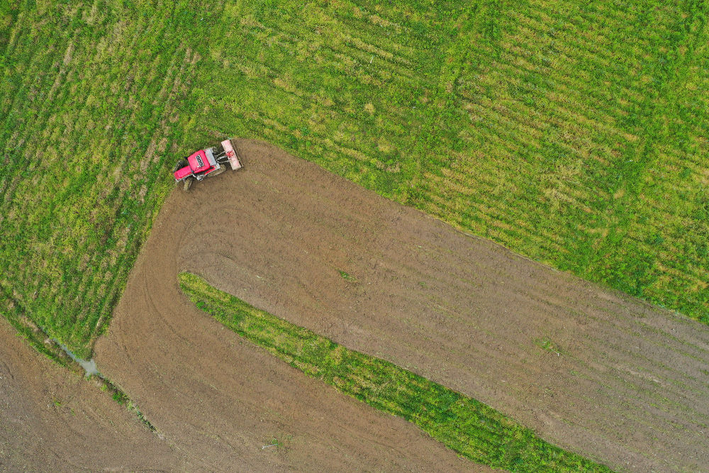 4月4日,在贵州省遵义市余庆县白泥镇满溪村,一台农耕机在地里耕地(无人机照片)。新华社发(穆明飞 摄)