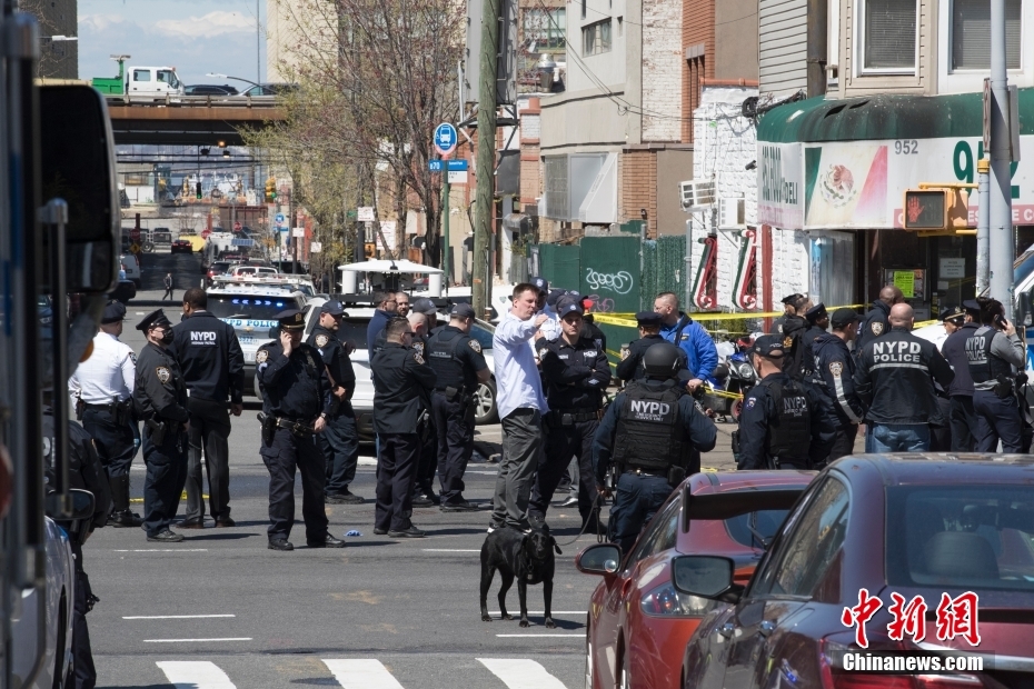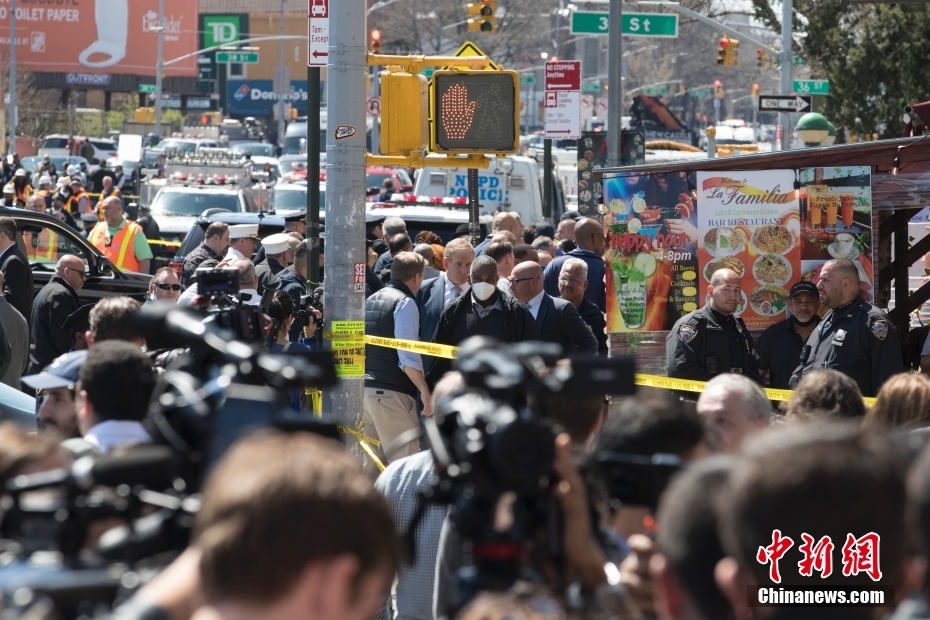 当地时间4月12日,美国纽约市布鲁克林区36街地铁站发生枪击案,至少16人受伤,其中10人直接中枪,大批警力和相关部门人员赶赴现场。图为发生枪击案的地铁站地面出入口。 中新社记者 廖攀 摄