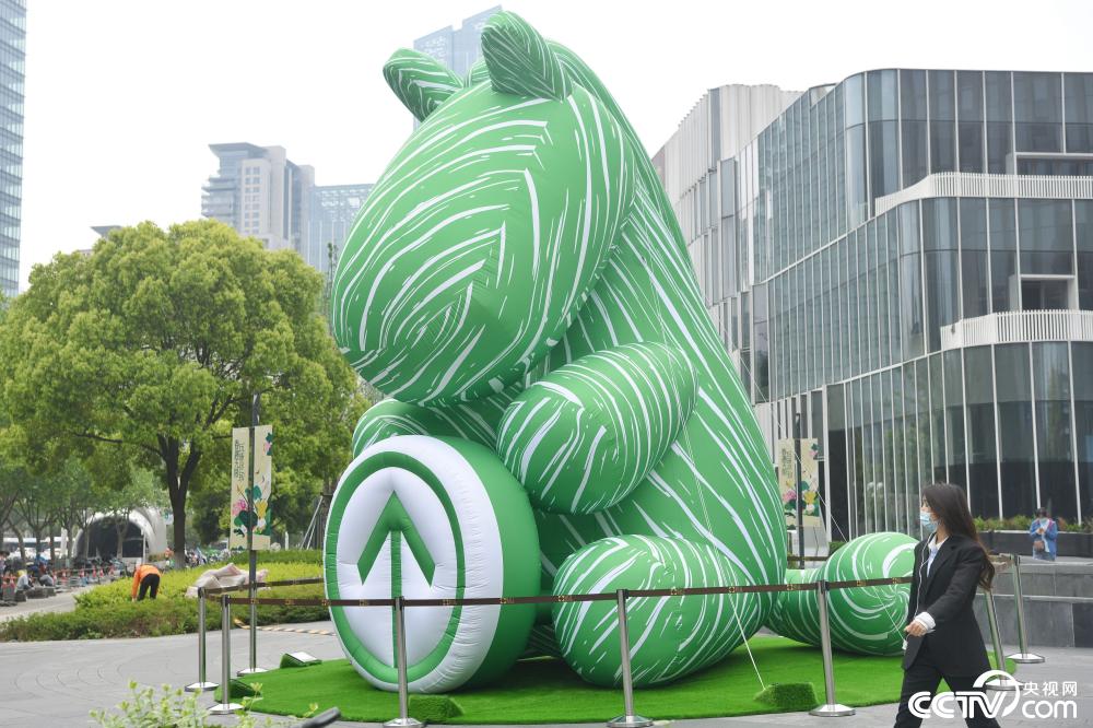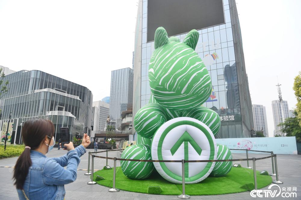 2022年4月13日,武汉街头出现大型“绿马抱绿码”充气造型,引来过往市民驻足拍照。据了解,抱住绿码谐音保住绿码,寓意抗疫会马到成功。 人民视觉