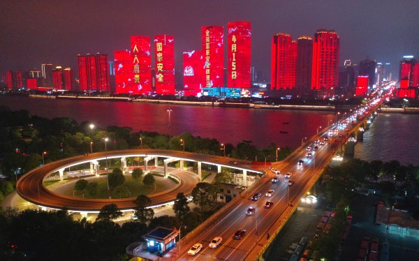 (4月14日晚,长沙湘江两岸上演一场别开生面的国家安全主题灯光秀,给广大市民带来了精彩的视觉盛宴。 湖南日报全媒体记者 傅聪 摄)