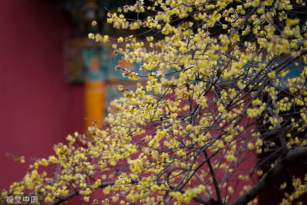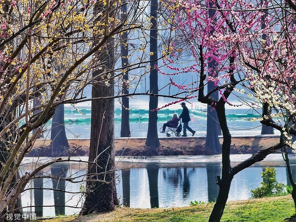 武汉东湖梅园,腊梅与梅花绽放,一位老先生推着老伴走在湖堤小路上。缪德杰/视觉中国